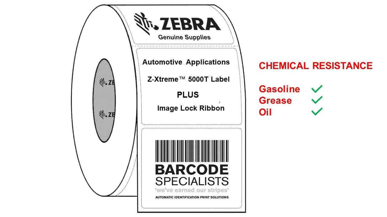 Due to the various environmental and harsh chemical elements the automotive industry has to deal with, it's essential to consider the types of labels for the intended use. For instance, labels used on the body of a car or inside the engine bay will require some form of heat, chemical and abrasion-resistance. The Zebra® Z-Xtreme™ 5000T, coupled with Zebra’s Image Lock™ ribbon, was designed to withstand heat, abrasion, and common harsh chemicals such as Gasoline, Engine Coolant, Motor Oil, Transmission fluid, Grease, Denatured Alcohol, Acetone, Xylene and many other harsh chemicals the automobile industry is challenged with.