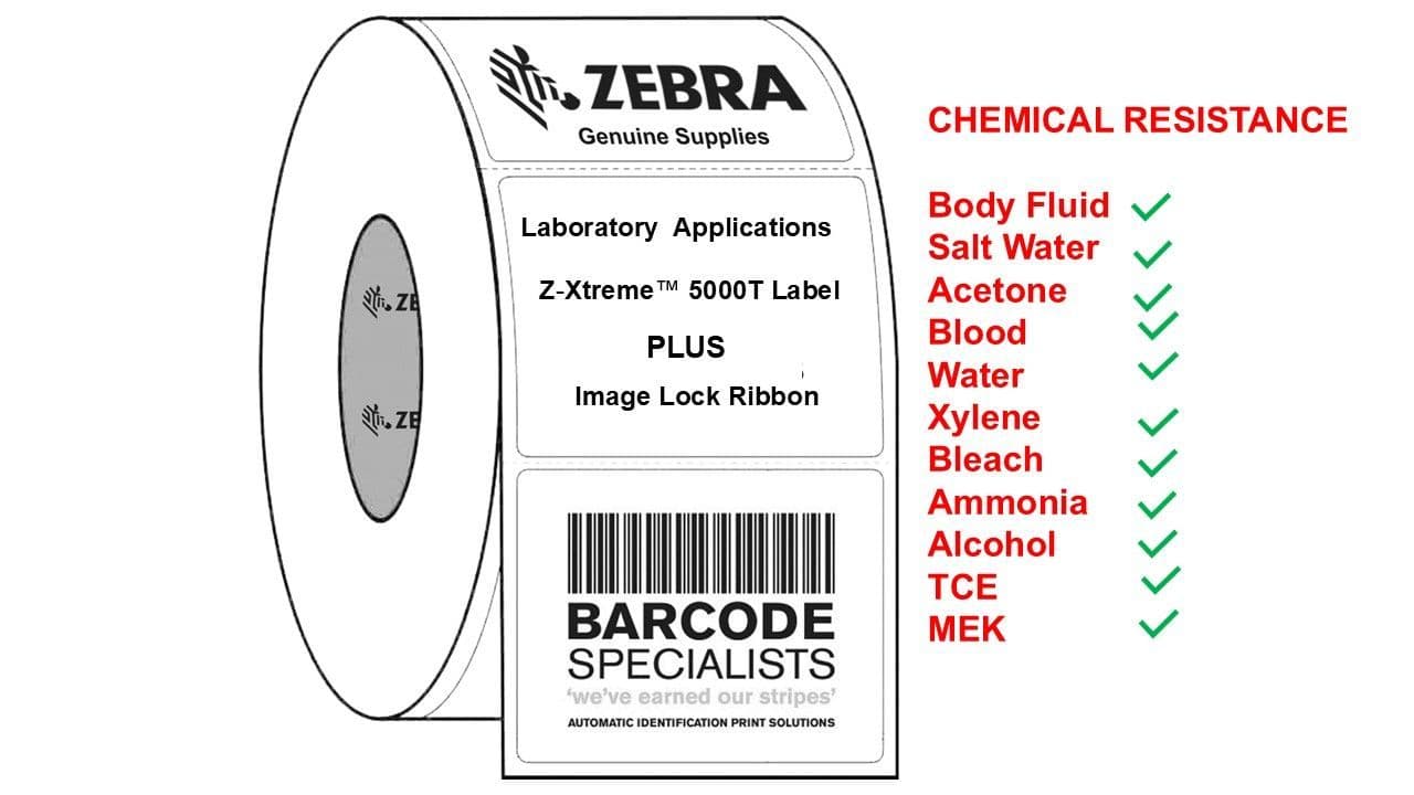 The importance of using labels with a “strong durability and resistance” when utilised in the laboratory is a critical component of your patient safety system. If the label becomes unreadable, unscannable or falls off during testing, it can cause a sample identification error that could lead to an adverse event, re-testing, redraws and additional treatment. The Zebra® Z-Xtreme™ 5000T, coupled with Zebra’s Image Lock™ ribbon, was designed to withstand most common stains and chemicals found in laboratories—ensuring that the label does not discolour and the text and bar code remain readable and scannable during the label’s useful life.