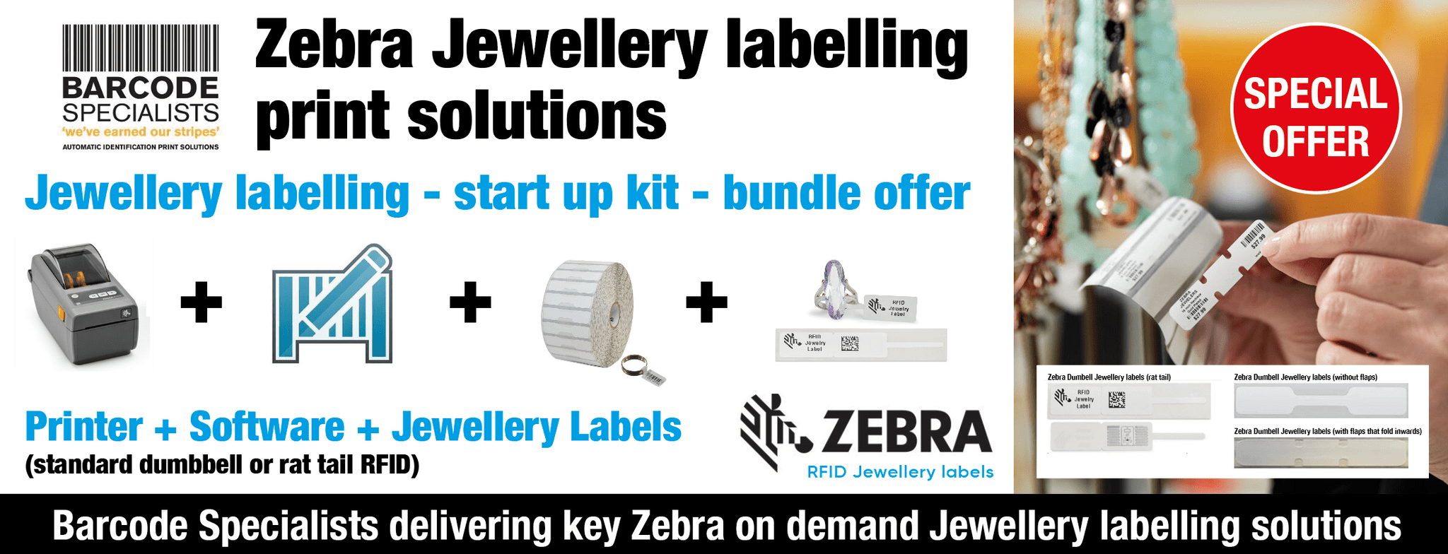 Barcode Specialists in partnership with Zebra Technologies are offering a turn key labelling solution for the jewellery retail sector. Providing both RFID and standard jewellery labels, combined with Zebra's labelling software, helping you to create your own label templetes to support your print requirments.
